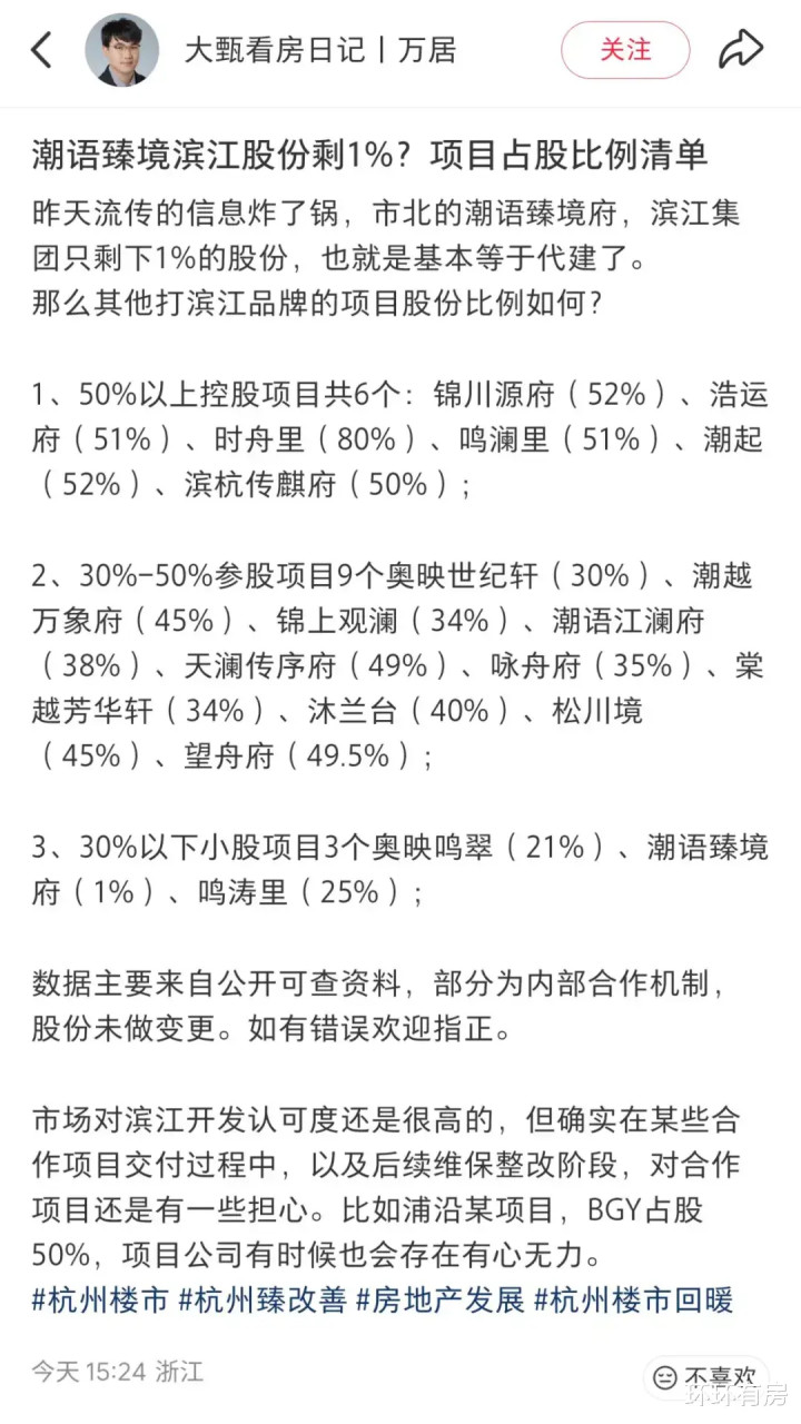 浙江本土自媒体“大甄看房日记”总结了滨江集团在一部分项目中的占股清单,环环附在问后,供参考。