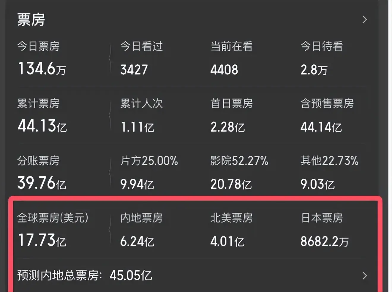 内地总票房是44.13亿,占据了最大的票仓,北美的票房也不错,有4亿多美元。